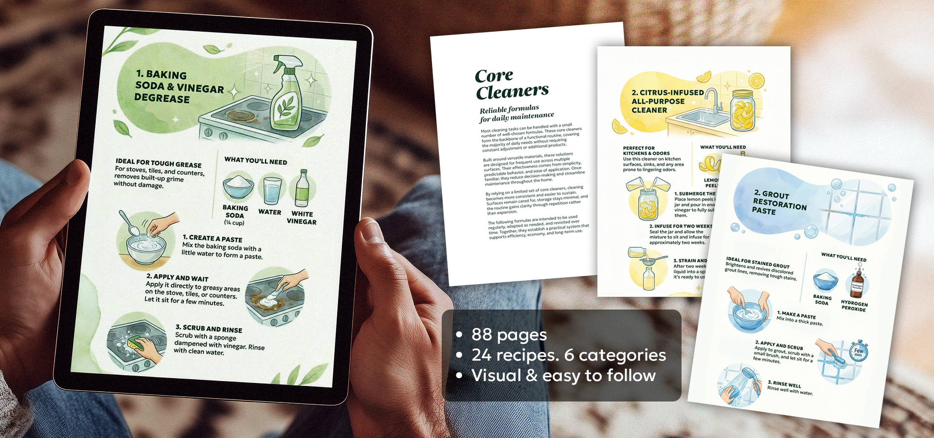 The content is organized to support everyday use, with clear explanations and a strong focus on real-life application. The goal is to simplify cleaning, reduce unnecessary consumption, and create a more economical and sustainable routine — without compromising a clean, well-maintained home.